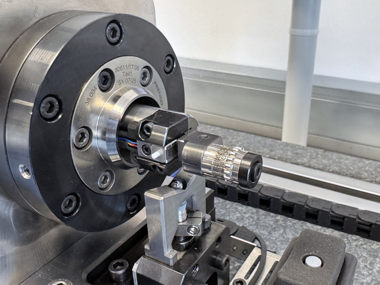 The measurement process involves storing corresponding rotation angles and measured values in the measurement box. The workpiece is mounted on a floating rotary bearing – either on a headstock with a chuck or between centres against a tailstock – and measured during a continuous 360° rotation. Radially arranged measuring slides with transducers are positioned against the workpiece. During the rotational movement, the radial measured values are recorded and stored together with the rotational angle.